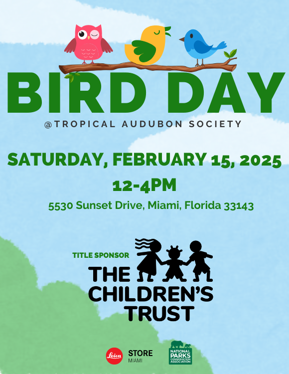 Calling budding birders and junior naturalists! Miami youth and their parents are invited to attend our free annual Bird Day festival featuring an engaging afternoon of games, prizes, exploration and educational activities on our wooded Steinberg Nature Center grounds. Bird Day, to be held on Saturday, February 15, Noon to 4pm, is the perfect venue for school ecology clubs, scout troops, families and young children seeking an outdoor adventure. Take part in Owl Pellet dissection. Draw and journal about the nature that surrounds you. Hone your binocular skills. Sing-along to songs about local ecosystems with folk artist Grant Livingston. The mid-winter event also celebrates the annual migration of nearly 350 bird species that stop in South Florida to refuel and recharge on their return flight from non-breeding grounds in the Caribbean, South America and Mexico on their way to nesting habitats in North America. Bird Day participants can also join TAS Field Trip Coordinator Brian Rapoza for a primer on the 2025 Great Backyard Bird Count, a community science initiative that enables birdwatchers of all ages to count birds and help create a real-time snapshot of where birds are located. Learn how your family can participate in the February 14-17 event! Additionally: Nature lovers can explore the trails that thread our restored Tropical Hardwood Hammock and Pine Rocklands demonstration forests. History buffs can tour the 1932 Doc Thomas House, which serves as TAS headquarters and is a designated Florida Heritage Site. Title Sponsor: The Children's Trust Hummingbird Sponsors: Leica Store Miami, National Parks Conservation Association. Click HERE to RSVP: https://support.tropicalaudubon.org/a/bird-day-2025